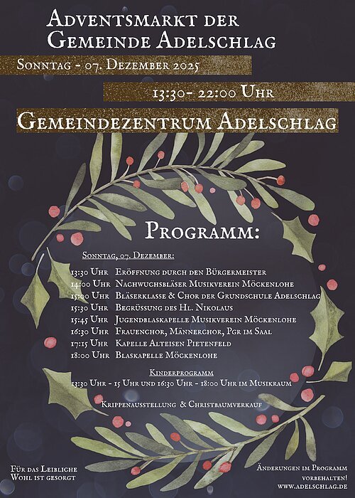 Die Gemeinde Adelschlag lädt alle Mitbürgerinnen und Mitbürger herzlich zum Adventsmarkt der Gemeinde am Sonntag, 7. Dezember 2025 ab 13.30 Uhr in Adelschlag am Gemeindezentrum ein.